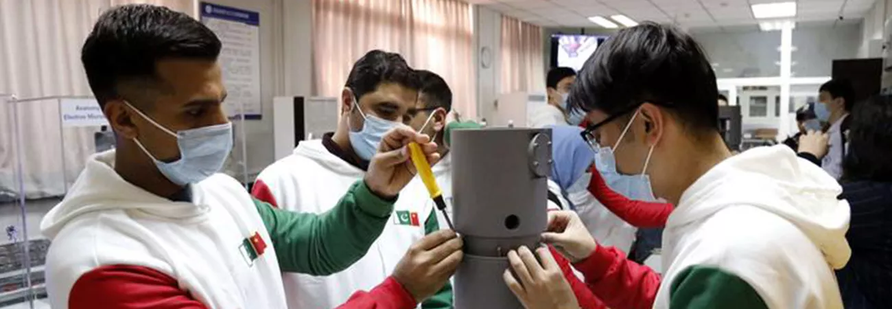 یونیورسٹی آف سائنس اینڈ ٹیکنالوجی بیجنگ میں پاکستانی اور چینی طلبا اسکیننگ الیکٹرون مائیکرواسکوپ کا ٹیچنگ ماڈل تیار کررہے ہیں۔ (شِںہوا)