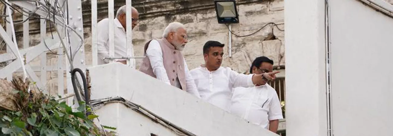 بھارتی وزیر اعظم نریندر مودی (بائیں سے دوسری جانب ) مغربی ریاست گجرات کے موربی ضلع میں منہدم ہونے والے پل کا معائنہ کررہے ہیں۔ (شِنہوا)