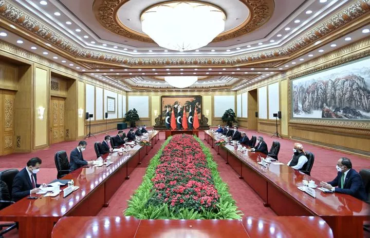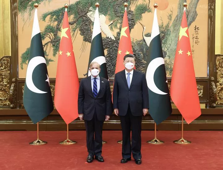 چین کے صدر شی جن پھنگ سے بیجنگ کے عظیم عوامی ہال میں پاکستانی وزیر اعظم شہباز شریف کے درمیان ملاقات کے موقع پر لی گئی تصویر۔(شِنہوا)