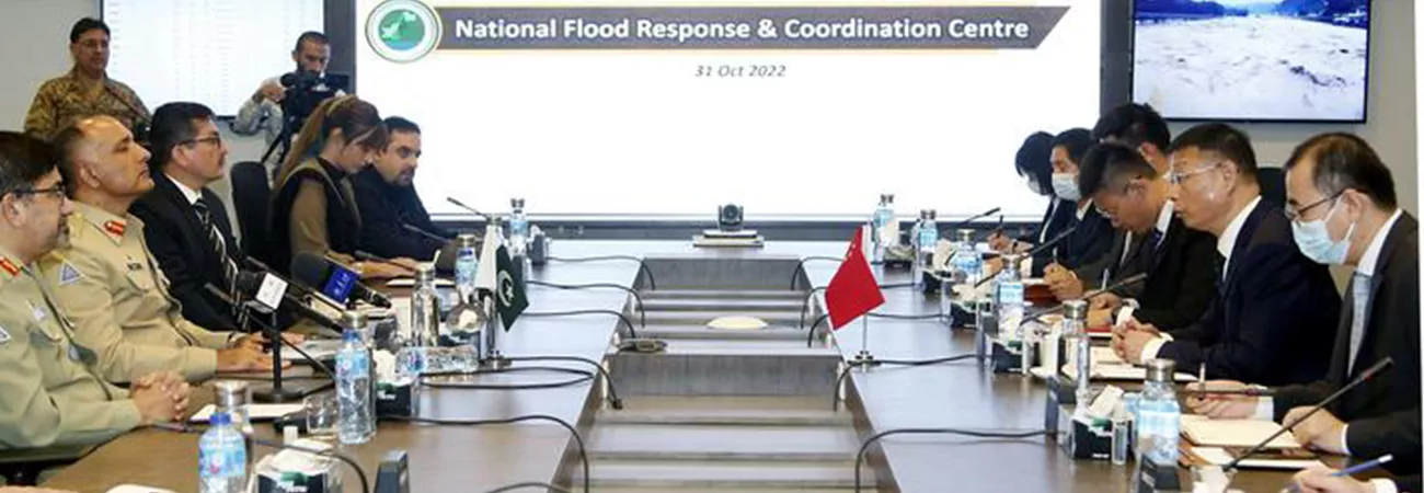 اسلام آباد، چینی طبی ٹیم کے سربراہ ہوانگ وین شین ( دائیں سے دوسرے) نے نیشنل ڈیزاسٹر مینجمنٹ اتھارٹی کے چیئرمین انعام حیدر ملک (بائیں سے دوسرے) کے ساتھ کام بارے تبادلہ خیال کیا۔ (شِںہوا)