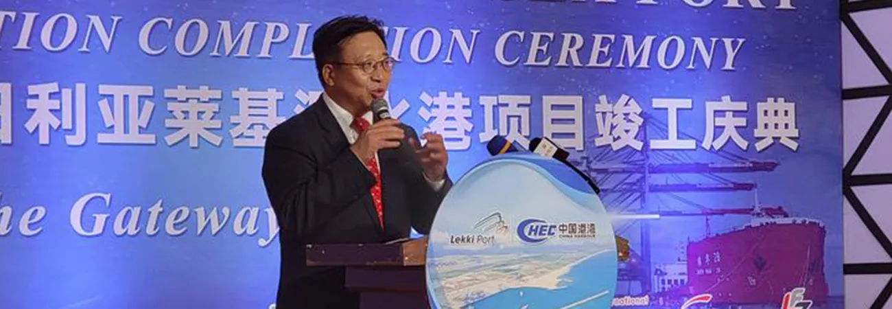 نائیجیریا کے لاگوس میں چین کے سفیر چھوئی جیان چھون لیکی گہرے سمندر کی بندرگاہ کی حوالگی کی تقریب کے موقع پر خطاب کر رہے ہیں۔(شِنہوا)