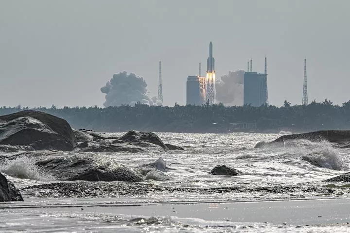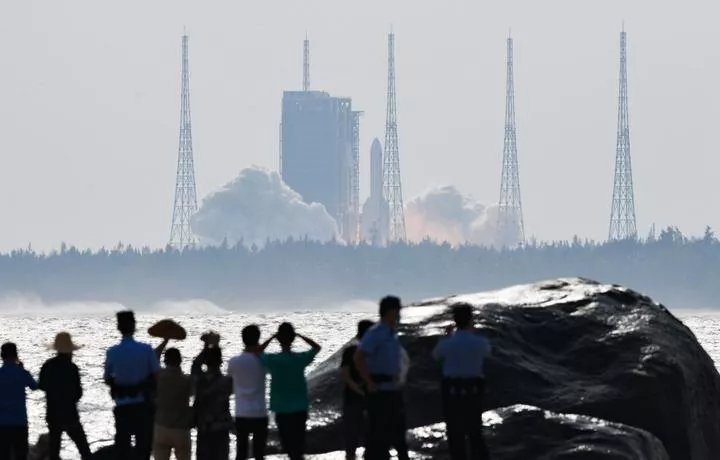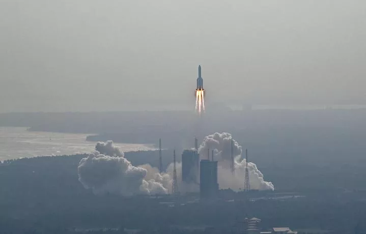 چین کے جنوبی ہائی نان میں وین چھانگ سپیس کرافٹ لانچ سائٹ سے ایک لانگ مارچ 5 بی وائے 4 مال بردار راکٹ کے ذریعے سپیس لیب ماڈیول مینگ تیان کو خلا میں بھیجا جا رہا ہے۔(شِنہوا)