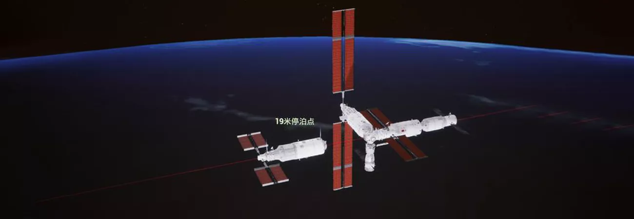 بیجنگ ایرواسپیس کنٹرول مرکز میں لی گئی تصویر میں مینگ تیان لیب ماڈیول کو تیان ہی کور ماڈیول کے سامنے کامیابی سے لنگرانداز ہوتے دیکھا جاسکتا ہے۔ (شِنہوا)