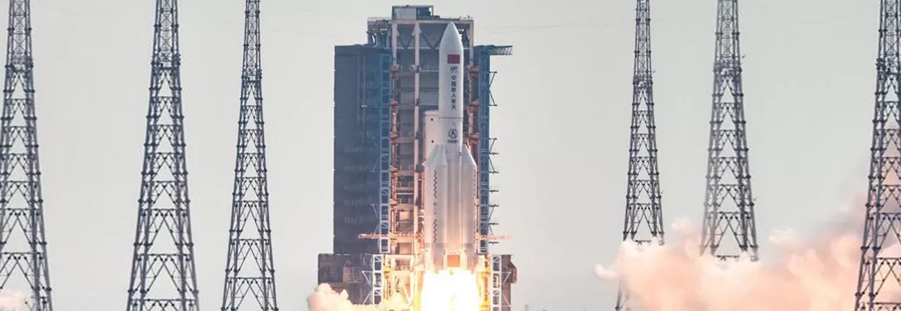 چین کے جنوبی ہائی نان میں وین چھانگ سپس کرافٹ لانچ سائٹ سے ایک لانگ مارچ 5 بی وائے 4 مال بردار راکٹ کے ذریعے سپیس لیب ماڈیول مینگ تیان کو خلا میں بھیجا جا رہا ہے۔(شِنہوا)