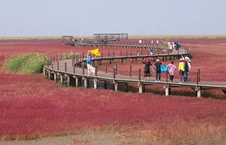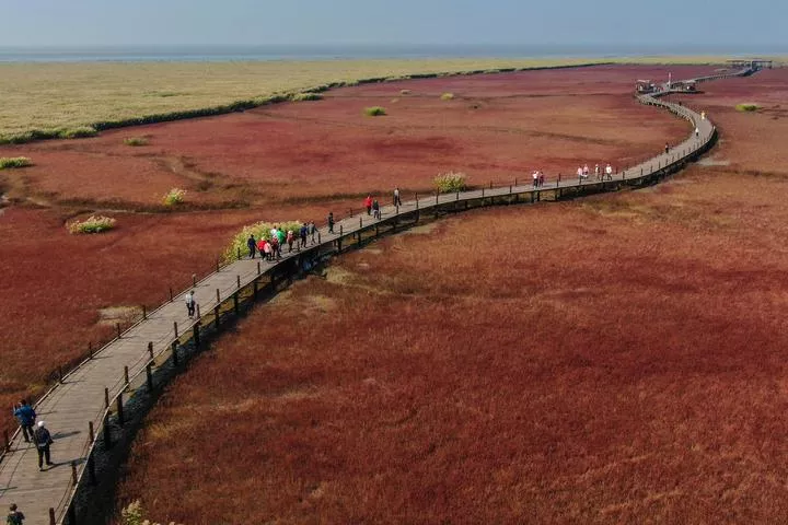 چین، شمال مشرقی صوبہ لیاؤننگ کے علاقے پان جن کے سرخ ساحل پر لوگ خوبصورت مناظر سے لطف اندوز ہورہے ہیں۔ (شِنہوا)