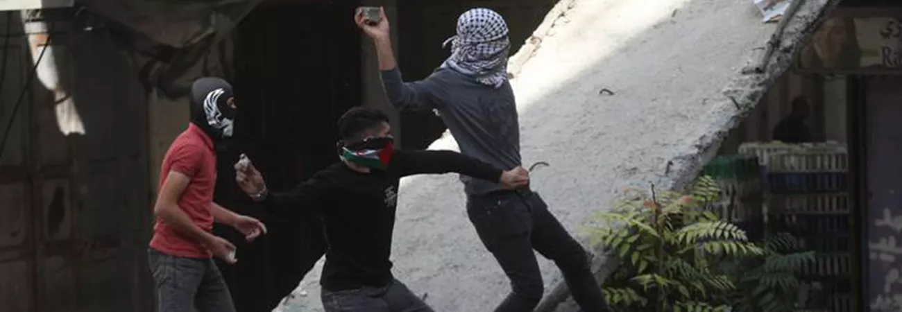 مغربی کنارے کے شہر الخلیل میں تصادم کے دوران فلسطینی مظاہرین اسرائیلی فوجیوں پر پتھراؤ کر رہے ہیں۔(شِنہوا)