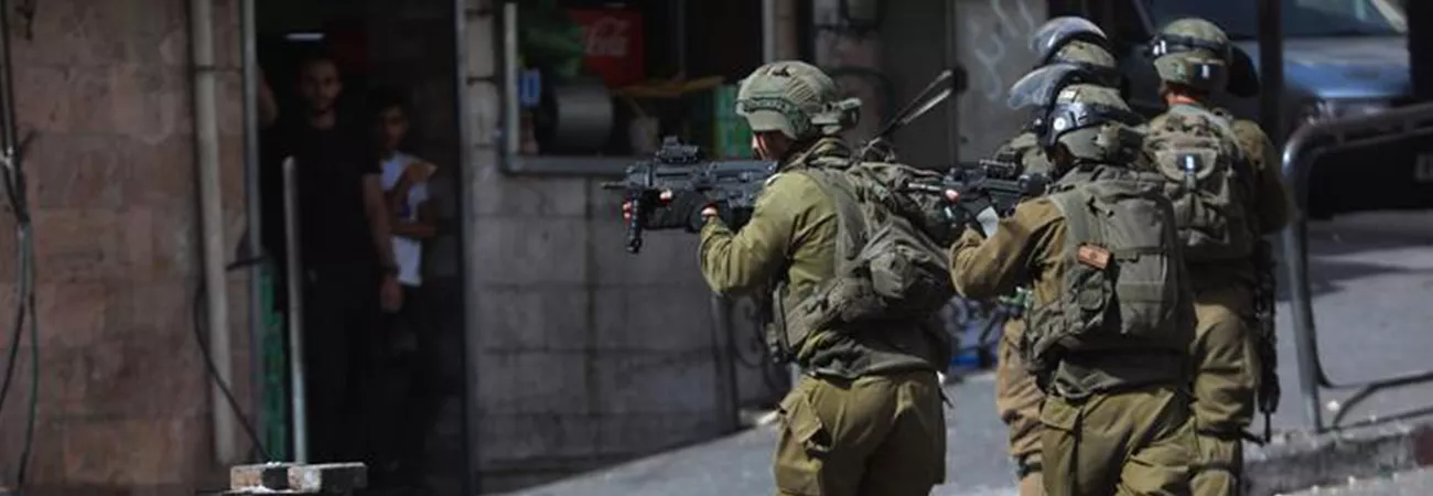 مغربی کنارے کے شہر الخلیل میں تصادم کے دوران اسرائیلی فوجیوں نے اپنی بندوقیں احتجاج کرنیوالے فلسطینی شہریوں پر تان رکھی ہیں۔ (شِنہوا)