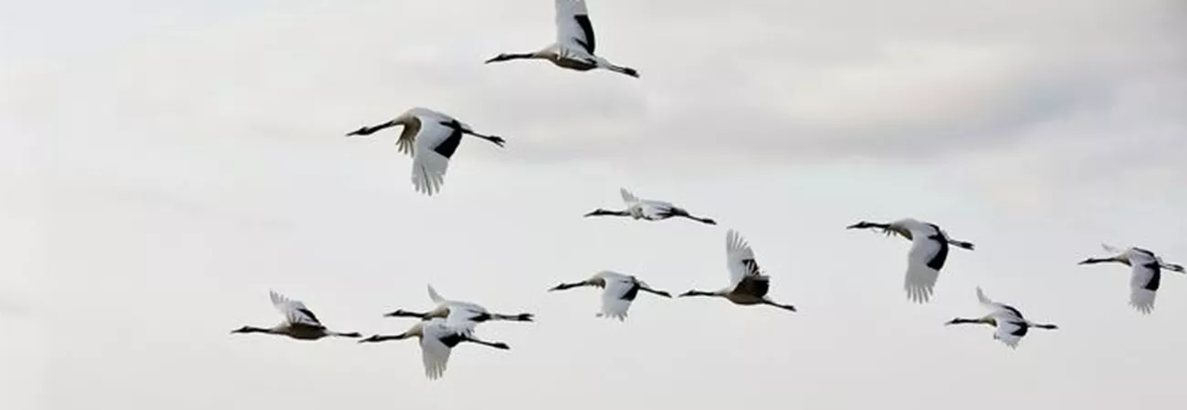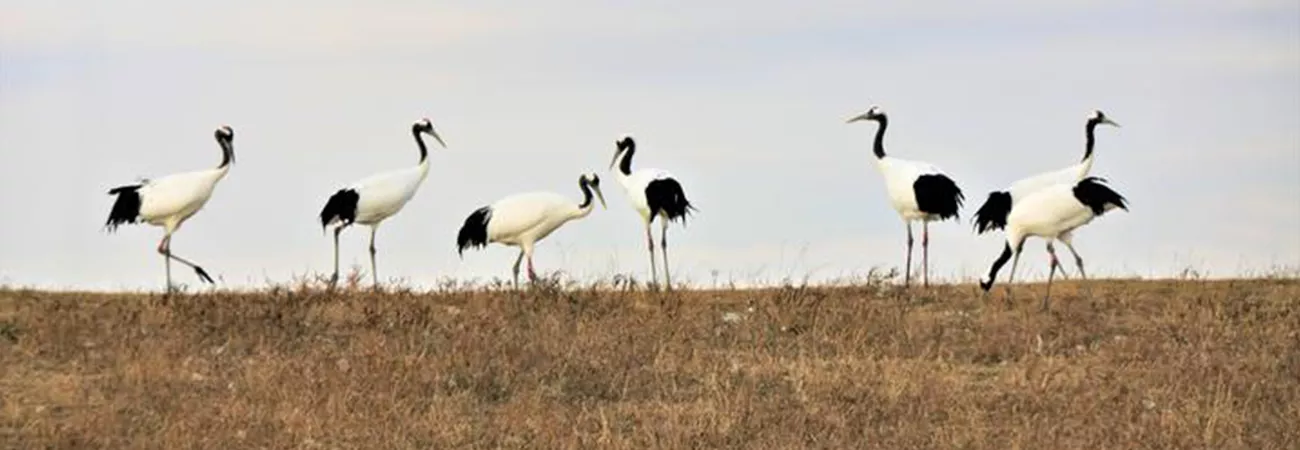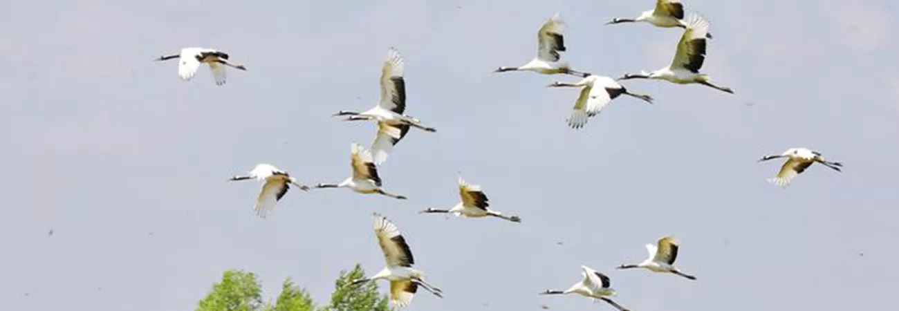 چین، شمال مشرقی صوبہ حئی لونگ جیانگ میں ژالونگ قومی قدرتی افزائش گاہ میں سرخ تاج والے سارس پرواز کررہے ہیں۔ (شِںہوا)