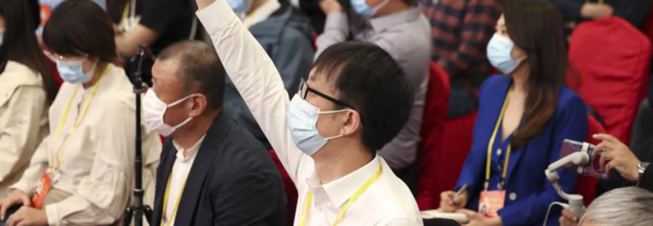 چین، دارالحکومت بیجنگ میں بذریعہ ویڈیو لنک منعقدہ پریس کانفرنس میں ایک صحافی سوال پوچھنے کے لئے ہاتھ بلند کر رہا ہے ۔(شِںہوا)