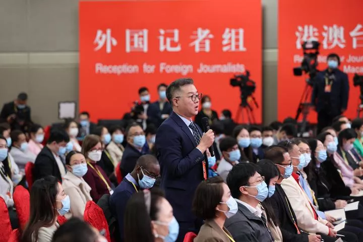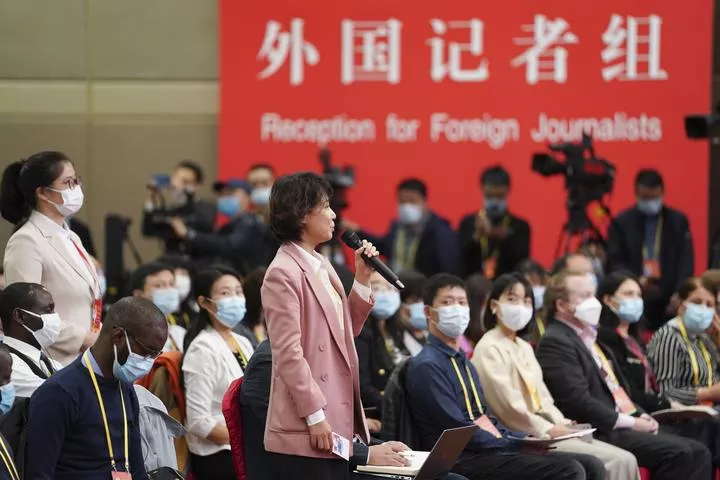 چین کے دارالحکومت بیجنگ میں کمیونسٹ پارٹی آف چائنہ (سی پی سی) کی جاری 20ویں قومی کانگریس کے موقع پر ہونے والی پریس کانفرنس کے دوران ایک صحافی ویڈیو لنک کے ذریعے سوال کرتے ہوئے۔(شِنہوا)