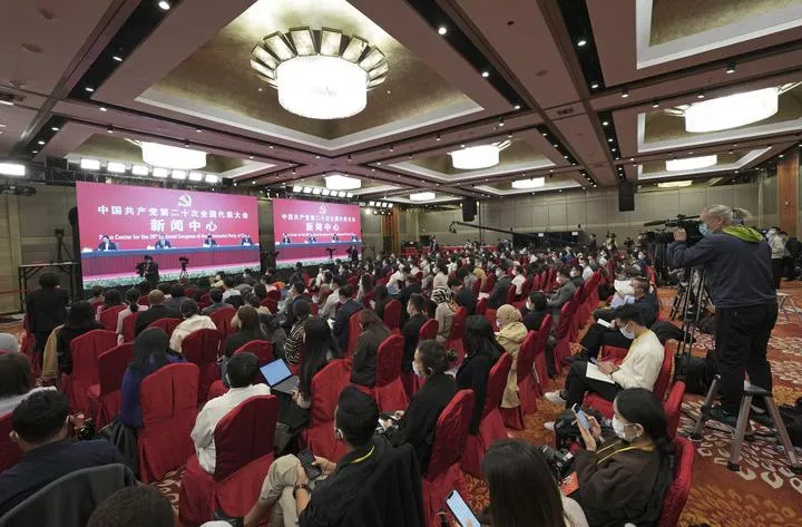 چین ، دارالحکومت بیجنگ میں جاری کمیونسٹ پارٹی آف چائنہ کی 20 ویں قومی کانگریس میں سائیڈ لائن پریس کانفرنس میں صحافی بذریعہ ویڈیو لنک شرکت کررہے ہیں۔ (شِنہوا)