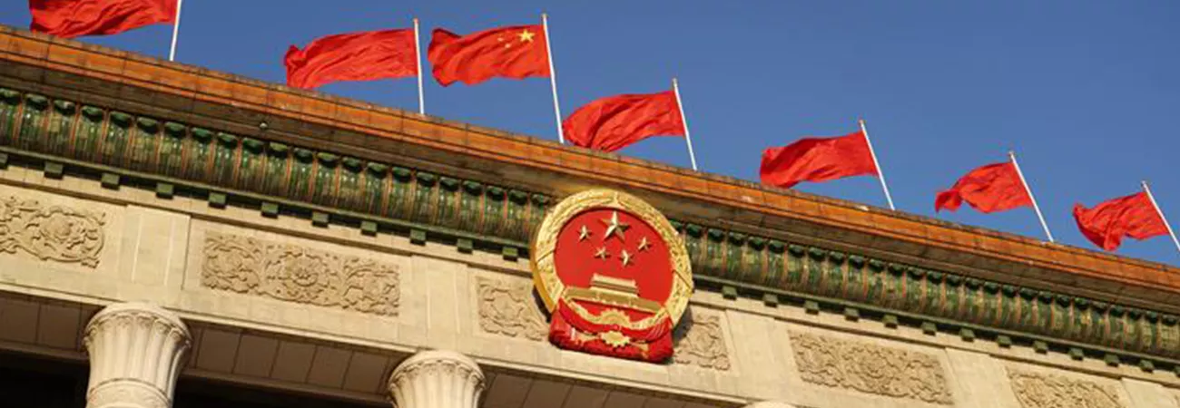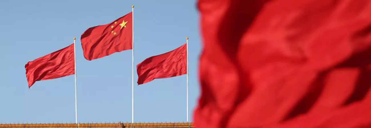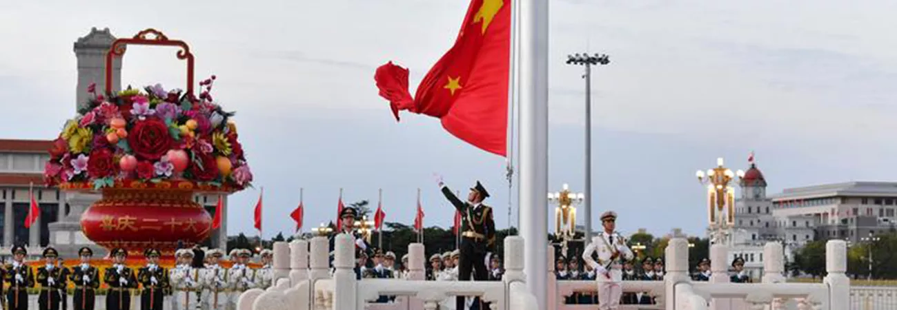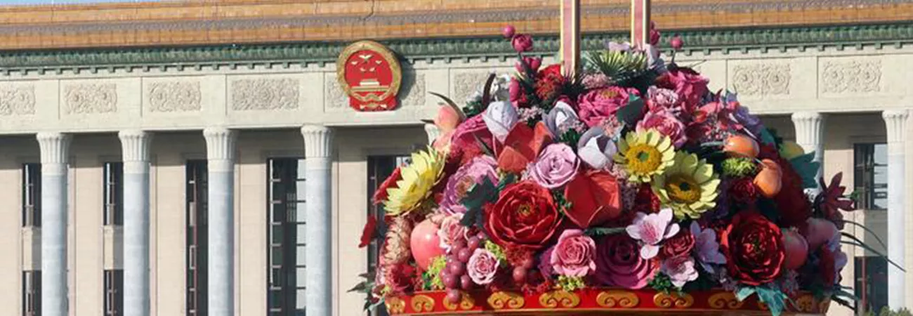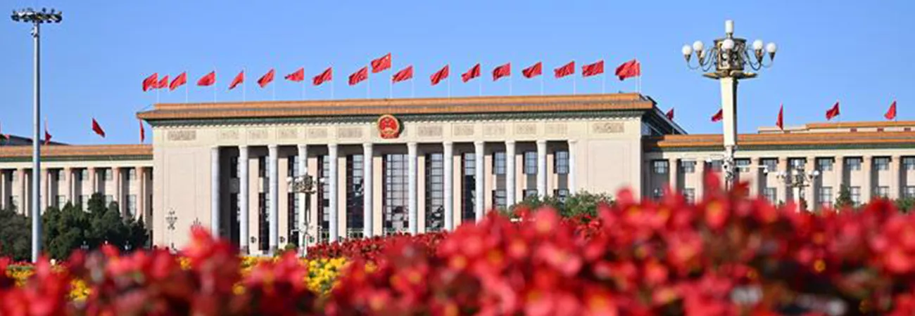 چین ،دارالحکومت بیجنگ کے تیان آن من اسکوائر میں عظیم عوامی ہال پر جھنڈے لہرا رہے ہیں۔ (شِنہوا)
