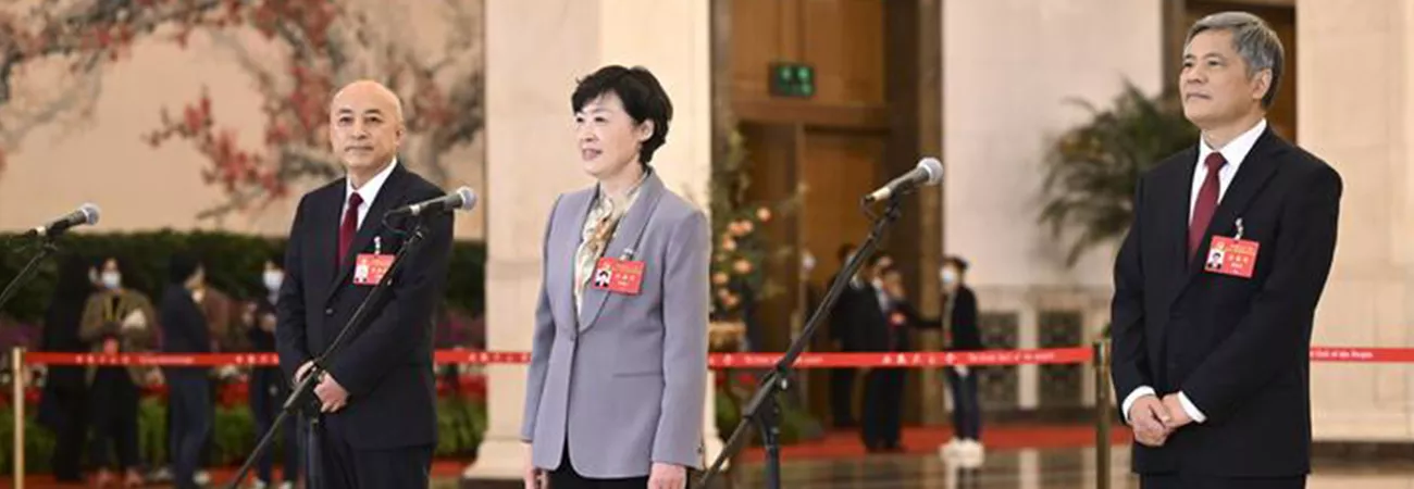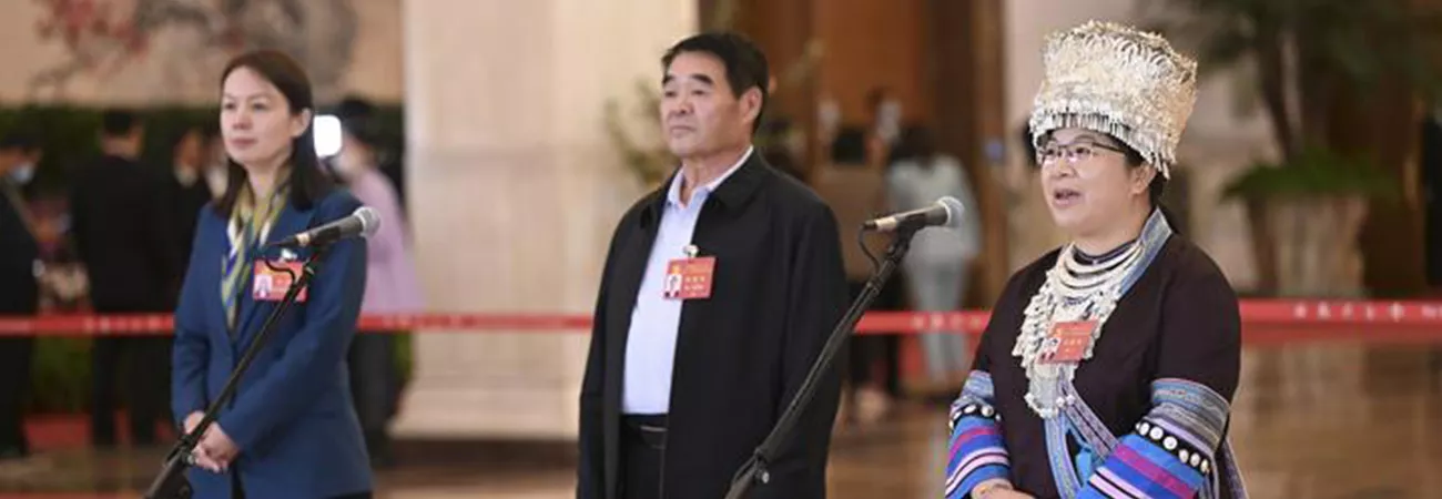چین کے دارالحکومت بیجنگ کے عظیم عوامی ہال میں کمیونسٹ پارٹی آف چائنہ کی 20 قومی کانگریس کے مندوبین (بائیں سے دائیں) وانگ شوڈونگ، چھیان سو یون، اور شیائی چھون تاؤ انٹرویو دے رہے ہیں۔ (شِنہوا)