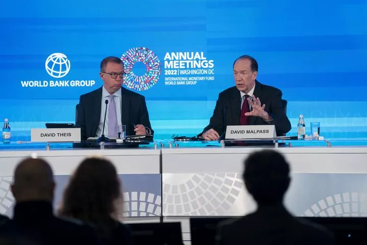امریکہ کے واشنگٹن ڈی سی میں ورلڈ بینک کے صدر ڈیوڈ مالپاس(دائیں) پریس کانفرنس کر رہے ہیں۔(شِنہوا)