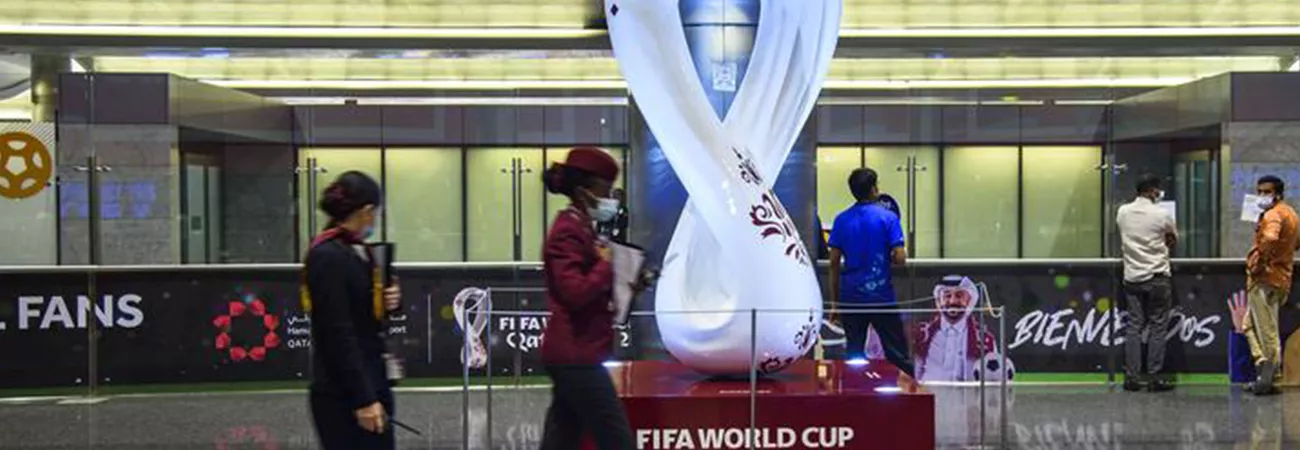 قطر کے دوحہ میں حماد انٹرنیشنل ایئرپورٹ پر لوگ فیفا ورلڈ کپ کے حوالے سے کی گئی سجاوٹ کے سامنے سے گزر رہے ہیں۔(شِنہوا)