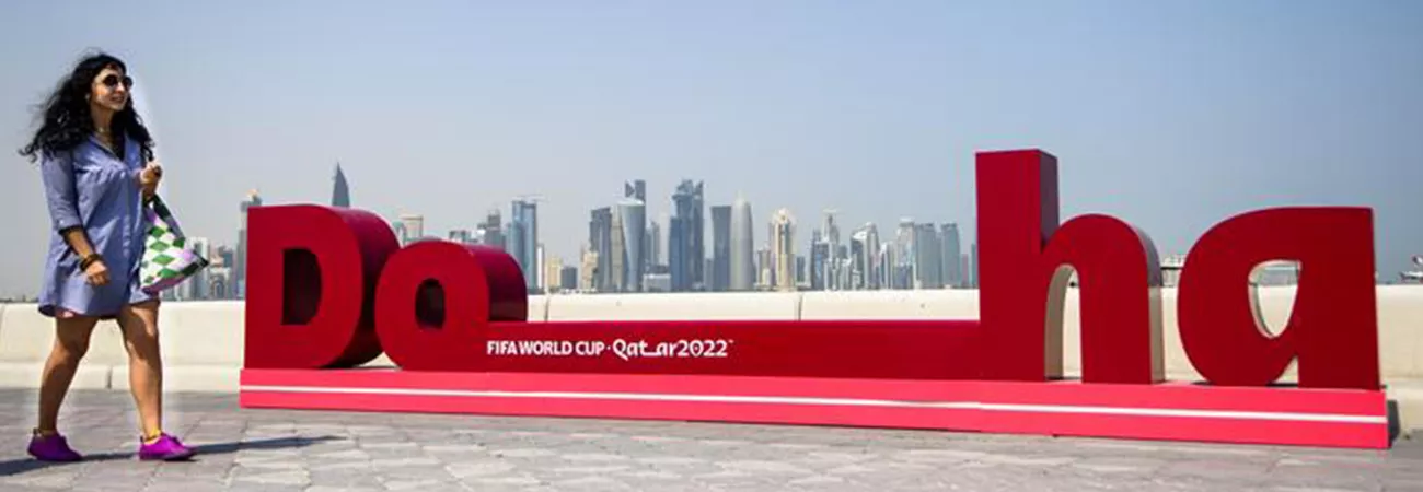 قطر کے دوحہ کورنیش پر ایک شہری فیفا ورلڈ کپ کے حوالے سے کی گئی سجاوٹ کے سامنے سے گزر رہی ہے۔(شِنہوا)