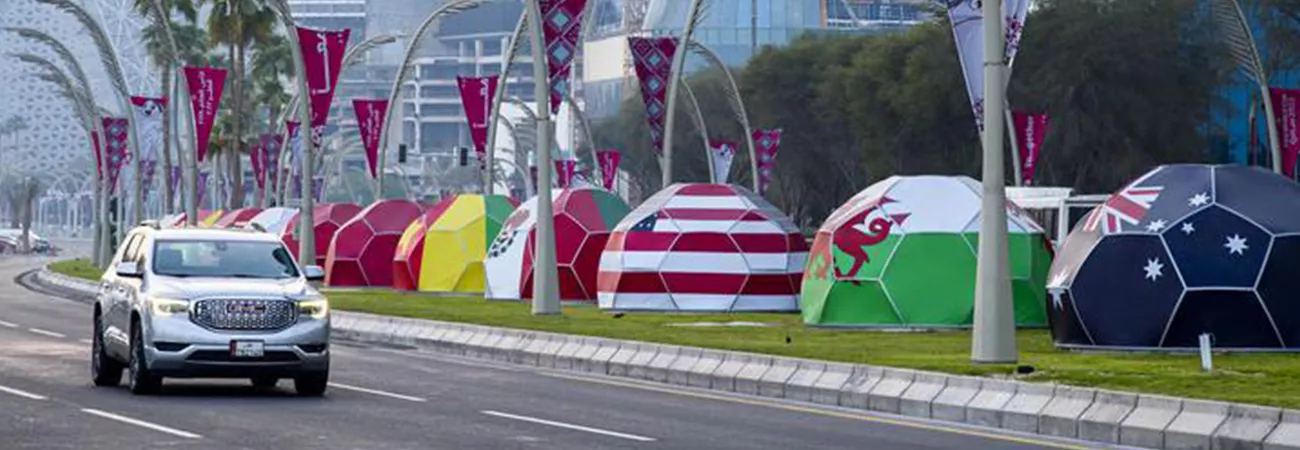 قطر کے دوحہ میں ایک گاڑی فیفا ورلڈ کپ کے حوالے سے کی گئی سجاوٹ کے سامنے سے گزر رہی ہے۔(شِنہوا)