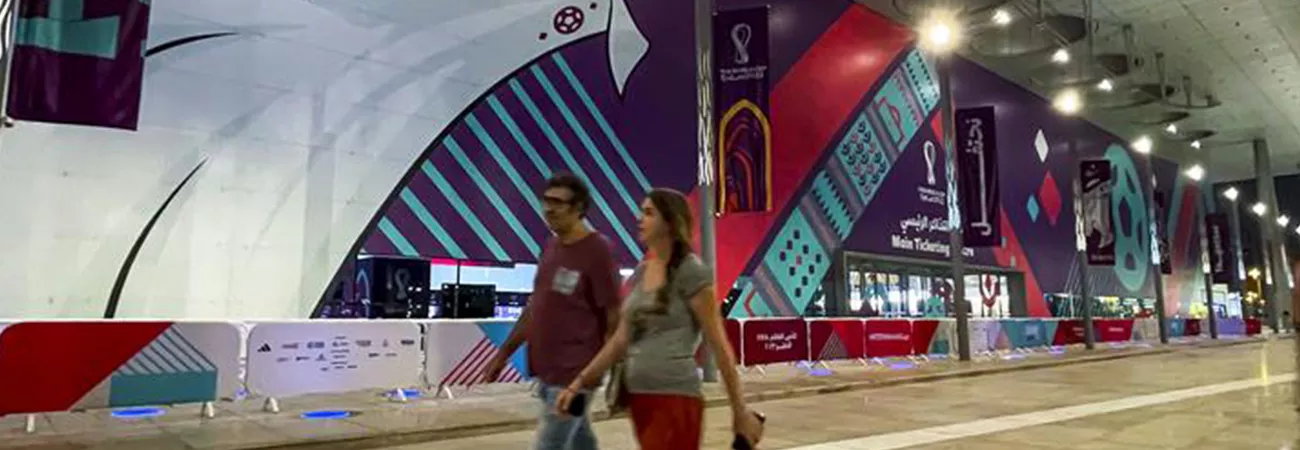 قطر کے دوحہ میں مرکزی ٹکٹنگ سنٹر میں لوگ فیفا ورلڈ کپ کے حوالے سے کی گئی سجاوٹ کے سامنے سے گزر رہے ہیں۔(شِنہوا)
