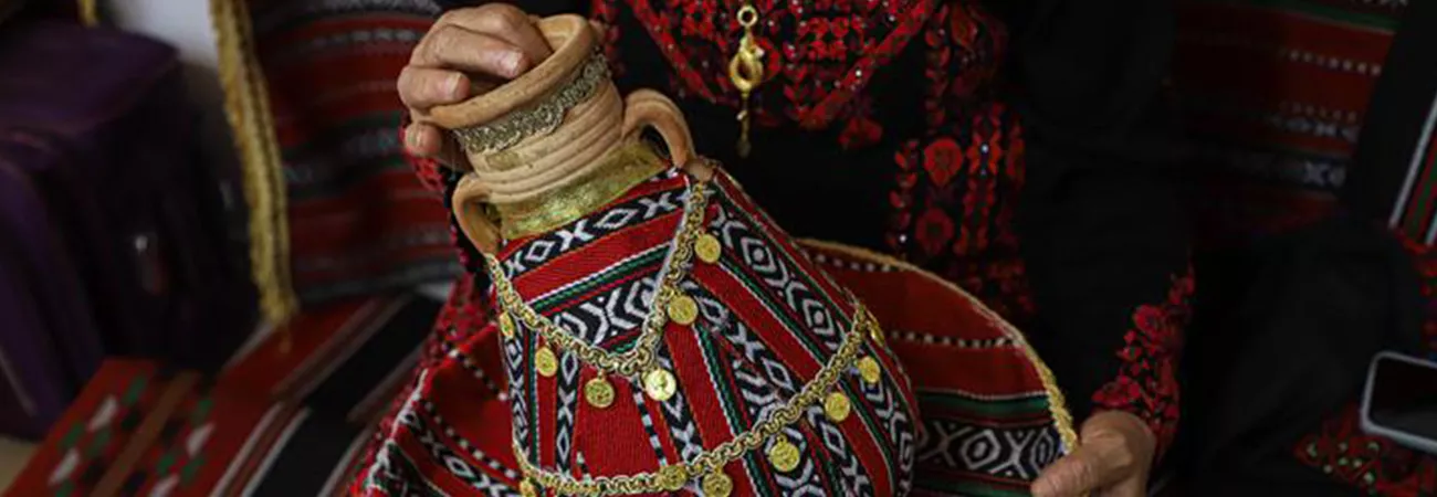 غزہ شہر میں فلسطینی قومی ورثے کے دن کے موقع پر منعقدہ میلے کے دوران ایک خاتون فن پارہ پیش کر رہی ہے۔(شِنہوا)