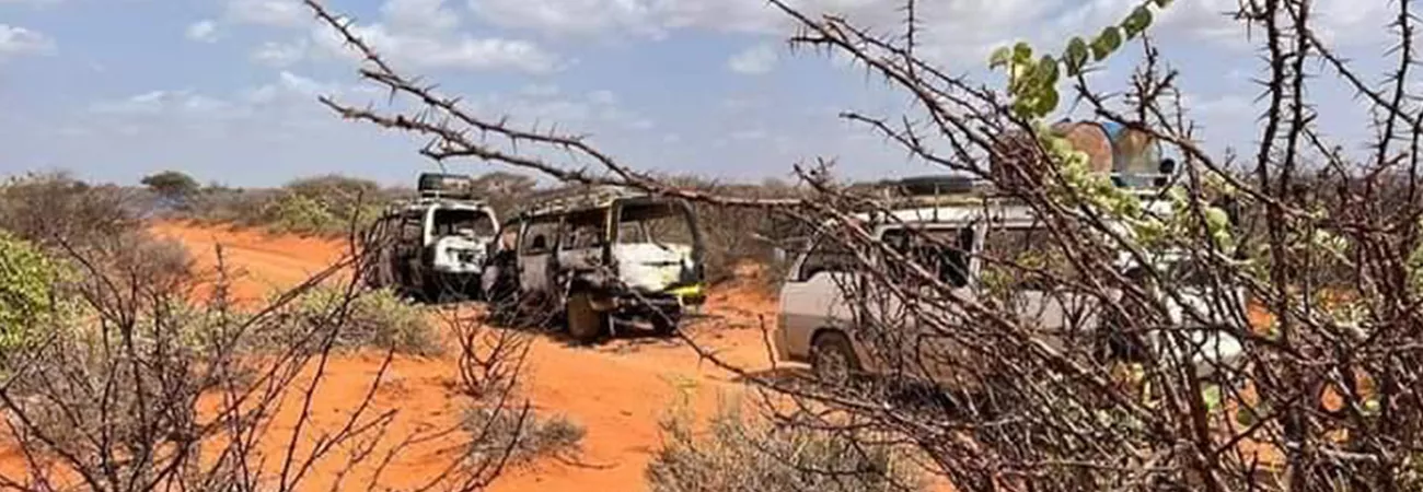 صومالیہ کی ریاست ہرشابیل کے انتظامی قصبے بلدوین کے مضافاتی علاقے میں حملے کی جائے وقوعہ کا ایک منظر۔(شِنہوا)