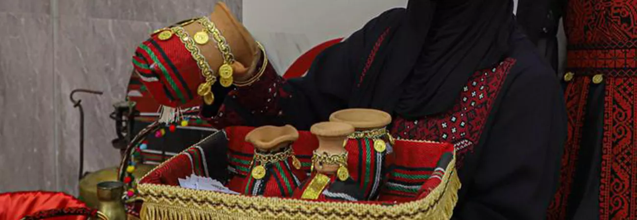 غزہ شہر میں فلسطینی قومی ورثے کے دن کے موقع پر منعقدہ میلے کے دوران ایک خاتون فن پارے ترتیب سے رکھ رہی ہے۔(شِنہوا)