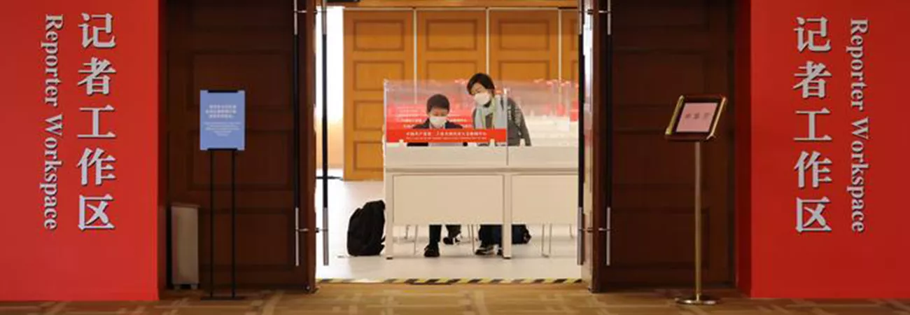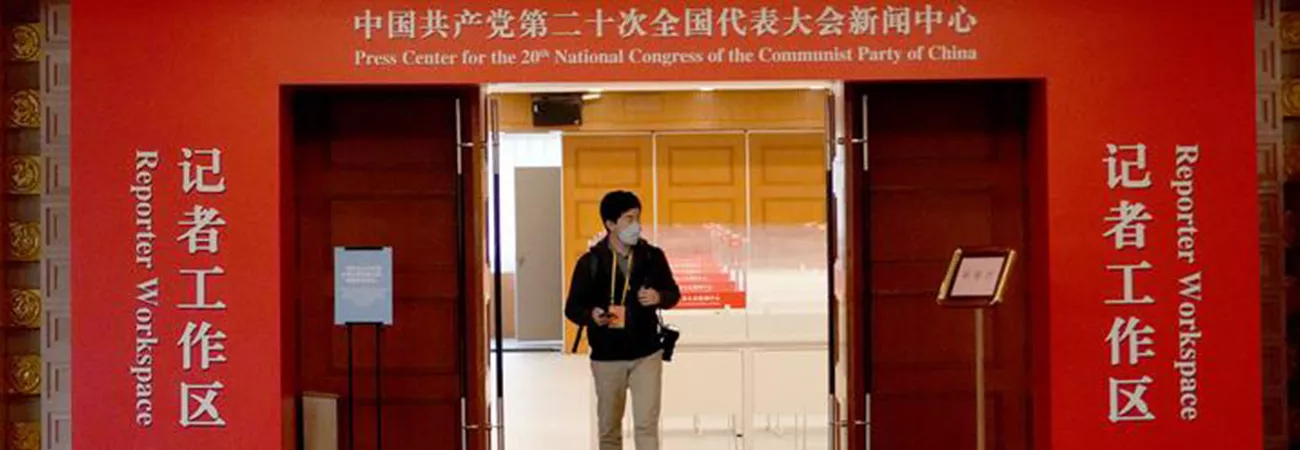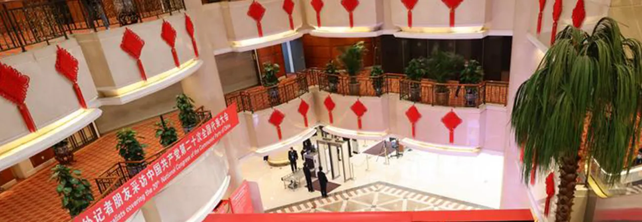 چین کے دارالحکومت بیجنگ میں کمیونسٹ پارٹی آف چائنہ (سی پی سی) کی 20 ویں نیشنل کانگریس کے پریس سنٹر میں نامہ نگاروں کیلے مختص جگہ کا ایک منظر۔(شِنہوا)