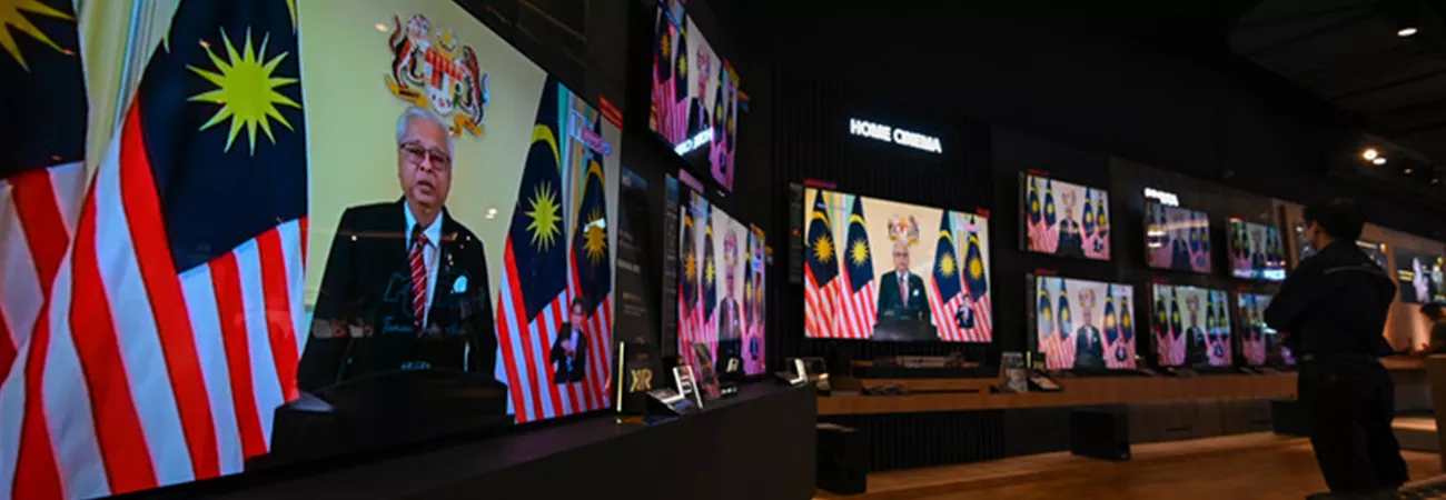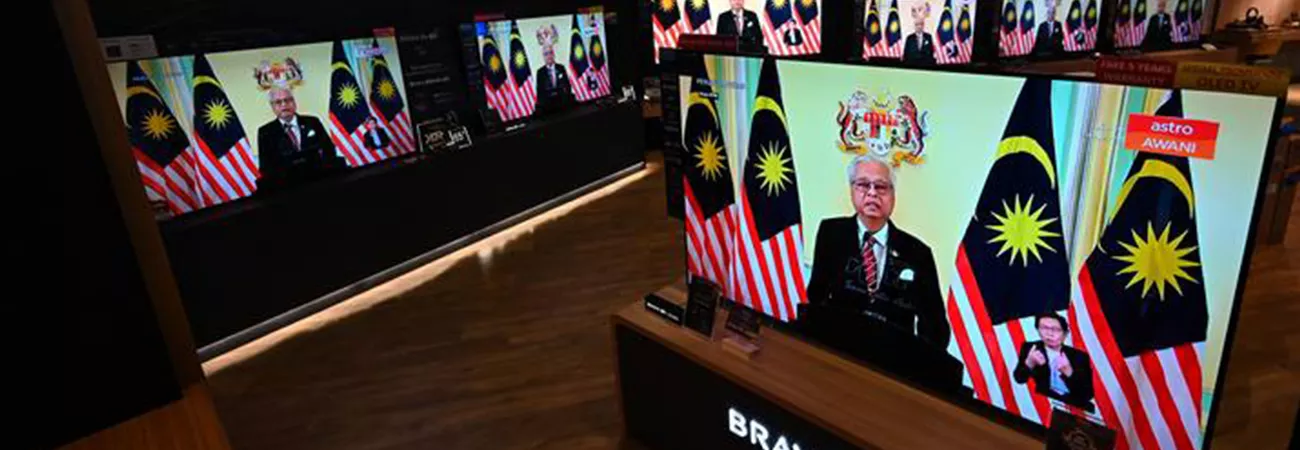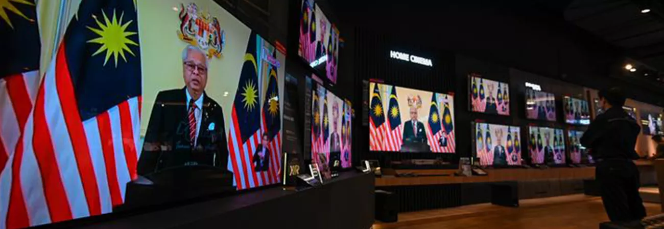 ملائیشیا کے کوالالمپور میں ایک شخص اپنے موبائل فون پر وزیراعظم اسماعیل صابری یعقوب کا خطاب سن رہا ہے۔ملائیشیا کے وزیراعظم نے پارلیمنٹ تحلیل کرنے کا اعلان کیا ہے۔(شِنہوا)
