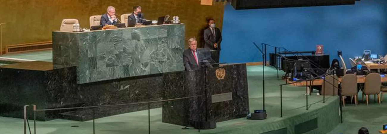 نیویارک ، اقوام متحدہ ہیڈکوارٹر میں یو این سیکرٹری جنرل انتونیو گوتریس(پوڈیم پر اور سکرین پر) جنرل اسمبلی کے مکمل اجلاس سے خطاب کر رہے ہیں۔(شِنہوا)