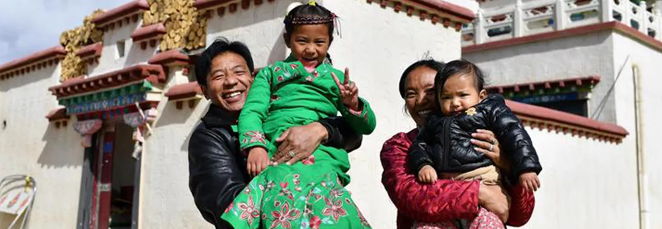 چین کے جنوب مغربی تبت خوداختیار خطے کے لہاسا کے گورم قصبے میں مقامی باشندوں کا اپنے نئے گھر کے باہر تصویر کیلئے ایک انداز ۔ (شِنہوا)