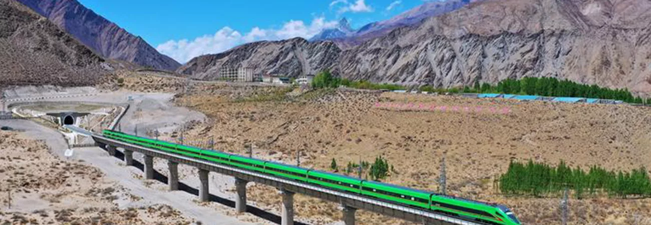 چین کے جنوب مغربی تبت خوداختیار خطے میں لہاسا۔ نی یانگ چھی ریلوے پر فوشنگ بلٹ ٹرین رواں دواں ہے۔ (شِنہوا)