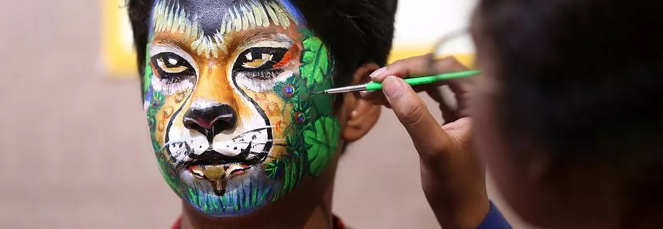 بھارت کی ریاست مدھیہ پردیش کے دارالحکومت بھوپال کے وین ویہار قومی پارک اور چڑیا گھر میں ہفتہ جنگلی حیات کے دوران منعقدہ چہرے پر پینٹنگ کے مقابلہ میں ایک طا لب علم کے چہرے پر پینٹنگ دیکھی جا سکتی ہے ۔ (شِںہوا)