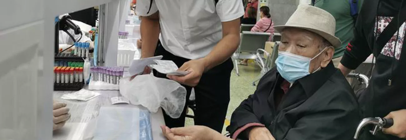 چین کے دارالحکومت بیجنگ کے اسپتال میں نرسنگ ہاؤس کیپر چھانگ ہاؤ (بائیں سے پہلا) 92 سالہ بزرگ مو کون لائی کی آنکھ کے آپریشن کی تیاری سے قبل ان کے ساتھ موجود ہے۔ (شِںہوا)