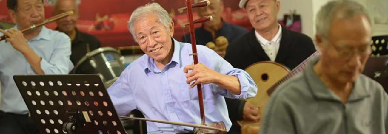 چین کے شمالی صوبہ ہیبے کے شہر شی جیا ژوآنگ کے ضلع لوآن چھنگ میں 80 سالہ بزرگ لیو مینگ فی (درمیان) ایک بینڈ میں شامل چینی آلہ موسیقی ارہو بجارہے ہیں۔ (شِنہوا)