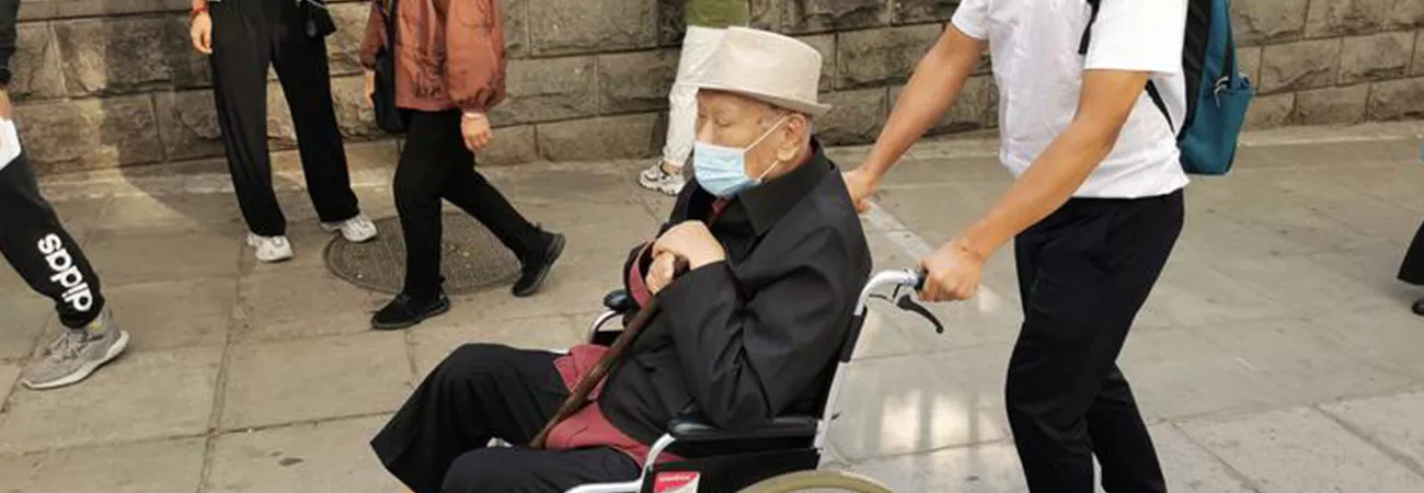 چین کے دارالحکومت بیجنگ میں نرسنگ ہاؤس کیپر چھانگ ہاؤ (دائیں) 92 سالہ بزرگ مو کون لائی کو اسپتال لیکر جارہا ہے ۔ (شِںہوا)