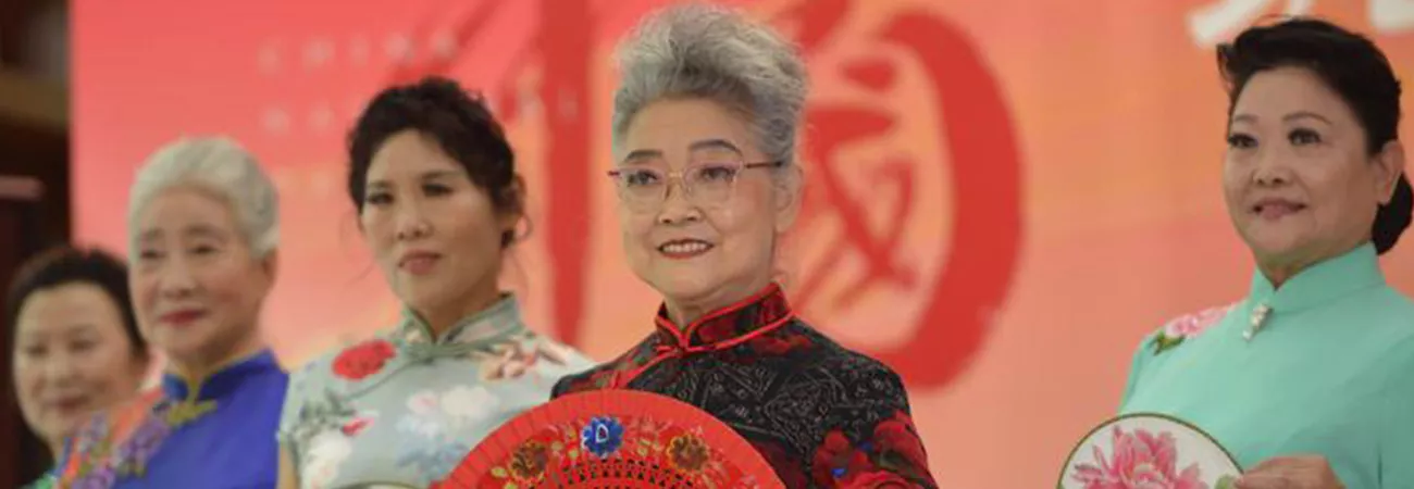 چین کے شمالی صوبہ ہیبے کے شہر شی جیا ژوآنگ کے ضلع شِنہوا میں ایک تقریب کے دوران 75 سالہ ہان ژیانگ چھاؤ (دائیں سے دوسری) بطور ماڈل فن کا مظاہرہ کررہی ہیں۔ (شِنہوا)