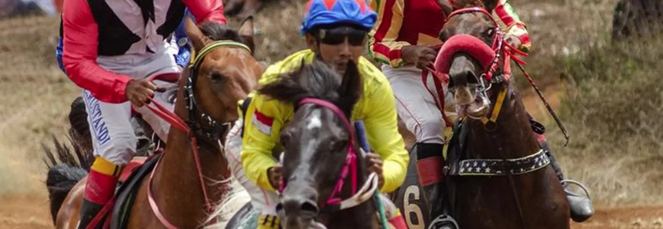 انڈونیشیا ، مغربی جاوا کے ضلع سومیڈانگ کے علاقے تان جونگ ساری میں روایتی گھڑدوڑ مقابلے میں جوکی مقابلہ کررہے ہیں۔ (شِنہوا)