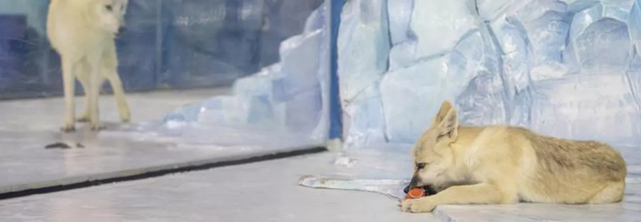 چین کے شمال مغربی صوبہ حئی لونگ جیانگ کے دارالحکومت ہاربن کے ہاربن پولرلینڈ میں ایک کلون برفانی بھیڑیا دیکھا جاسکتا ہے۔ (شِنہوا)