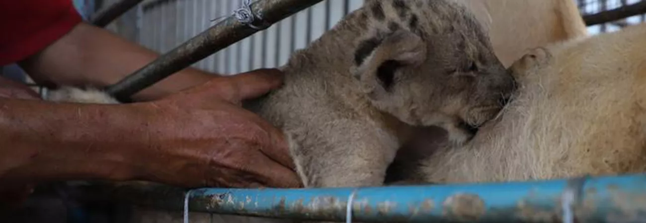 جنوبی غزہ پٹی کے نامہ چڑیا گھر کے ایک رکھوالے نے شیرکے 2 نوزائیدہ بچوں کو اٹھا رکھا ہے۔ (شِنہوا)
