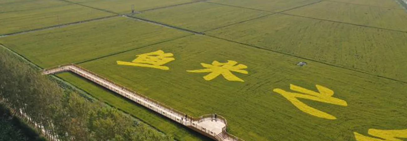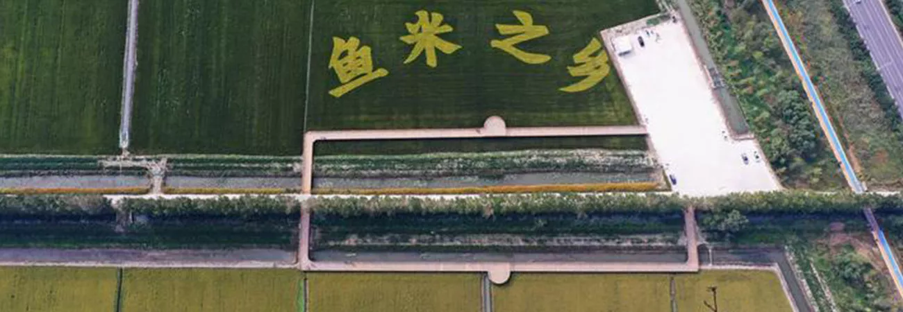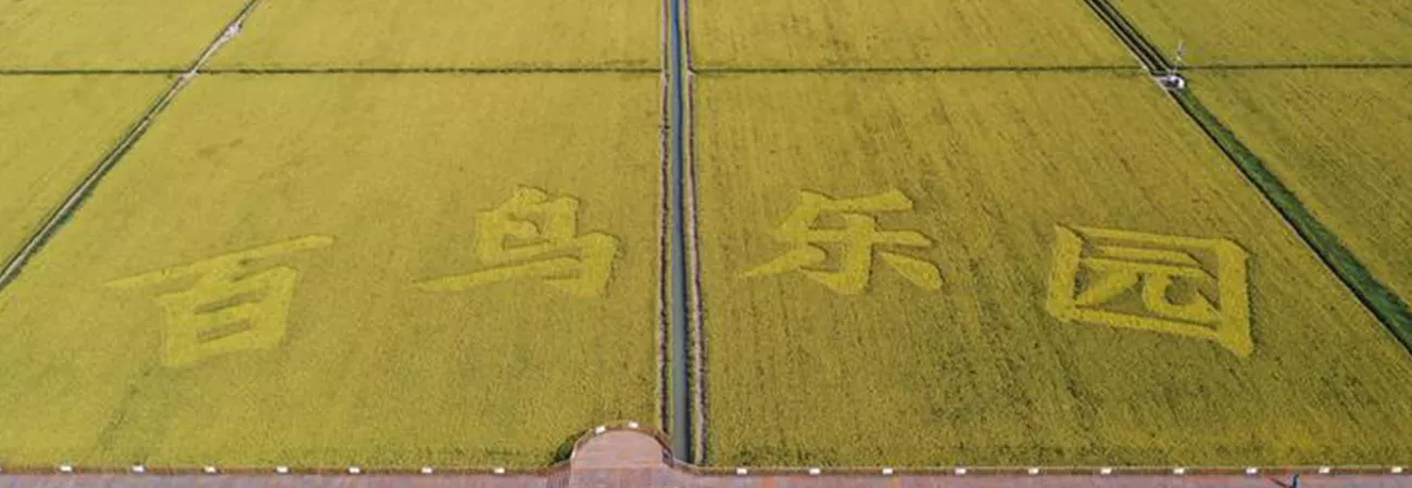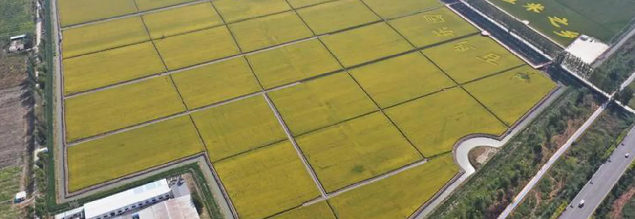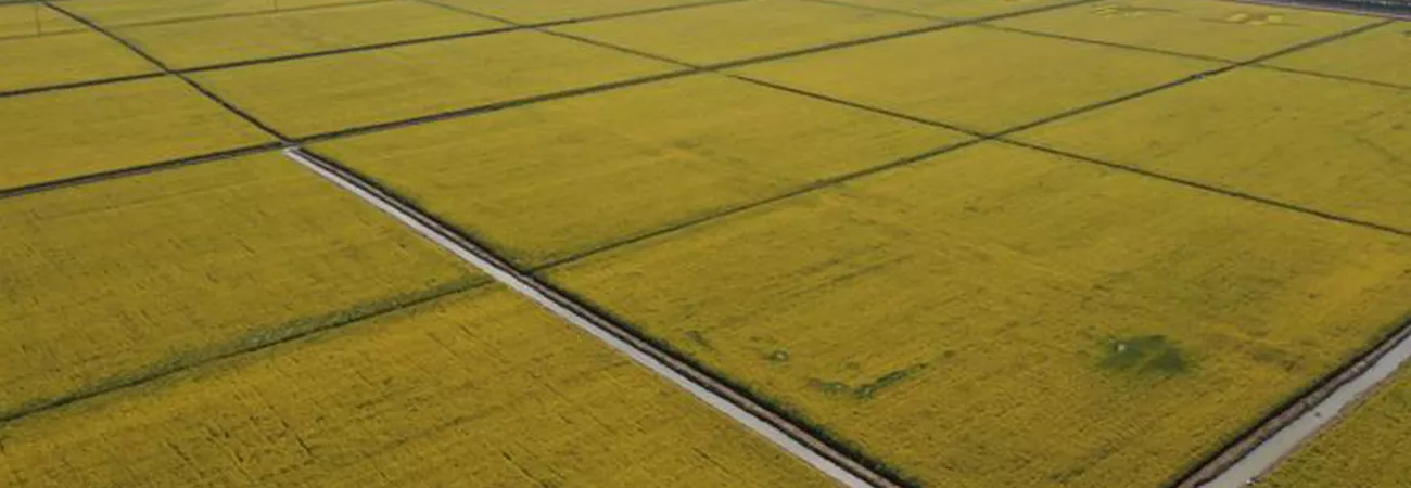 چین کے شمالی صوبہ ہیبے کے شیونگ آن نیوایریا کی کاؤنٹی این شن کے قصبے دا وانگ میں چاول کی کاشت کے علاقے میں دھان کے کھیت کا فضائی نظارہ۔ (شِنہوا)