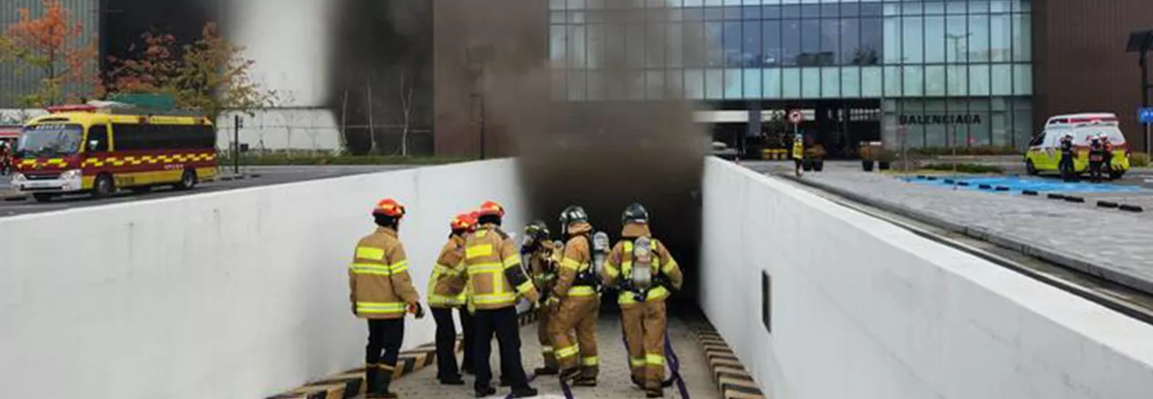 جنوبی کوریا کے ڈی جیون میں فائر فائٹرز خریداری مرکز میں لگی آگ پر قابو پانے کی کوشش کر رہے ہیں۔(شِنہوا)