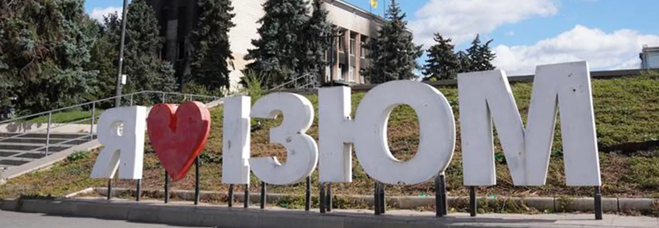 یوکرائن کے ایزیوم میں حملے کا نشانہ بننے والی سرکاری عمارت کا ایک منظر۔(شِنہوا)