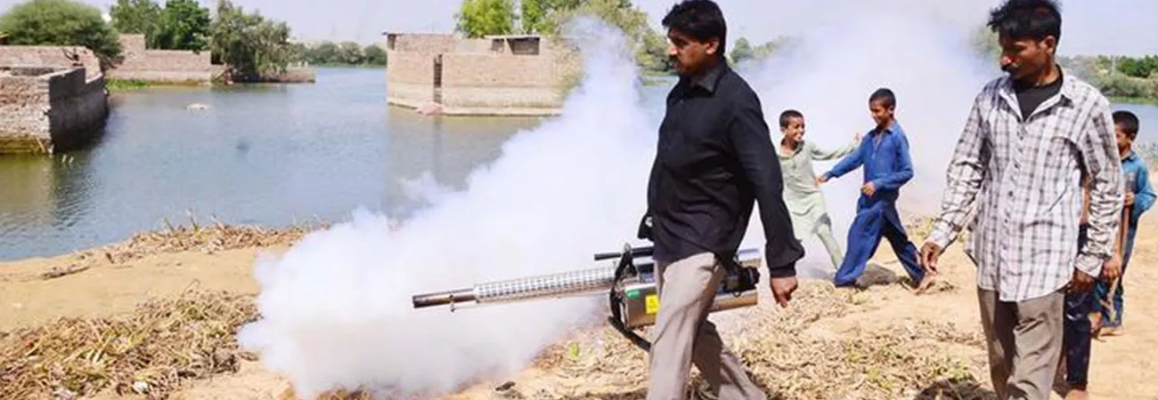 حیدرآباد کے مضافات میں طبی عملے کا ایک رکن مچھرمار سپرے چھڑک رہا ہے۔ (شِنہوا)
