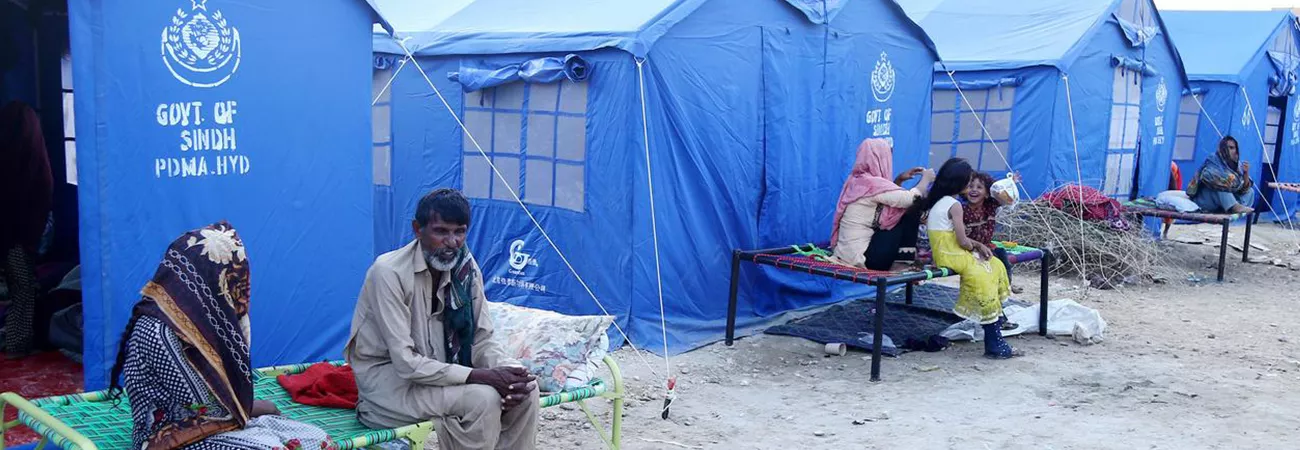 حیدرآباد کے نواح میں قائم خیمہ بستی میں سیلاب متاثرین کو دیکھا جاسکتاہے۔ (شِنہوا)