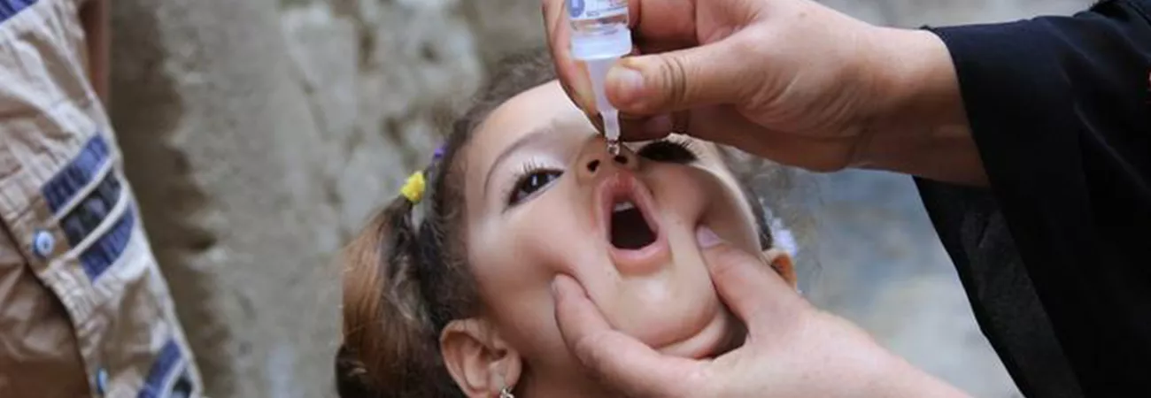 افغانستان ، کابل میں طبی کارکن انسداد پولیو ویکسی نیشن مہم کے دوران ایک بچی کو پولیو ویکسین پلارہی ہے۔ (شِنہوا)
