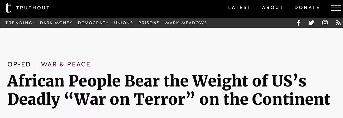 ویب سائٹ ٹروتھ آؤٹ پر جاری ہونےوالی رپورٹ کے مطابق ایفروکام کو 2007 میں براعظم کی بڑھتی ہوئی اسٹریٹیجک اہمیت کے پیش نظرتشدد پسند انتہا پسند تنظیموں کی نگرانی اور ان کو روکنے سمیت امریکی مفادات کے تحفظ کے لیے شروع کیا گیا تھا۔