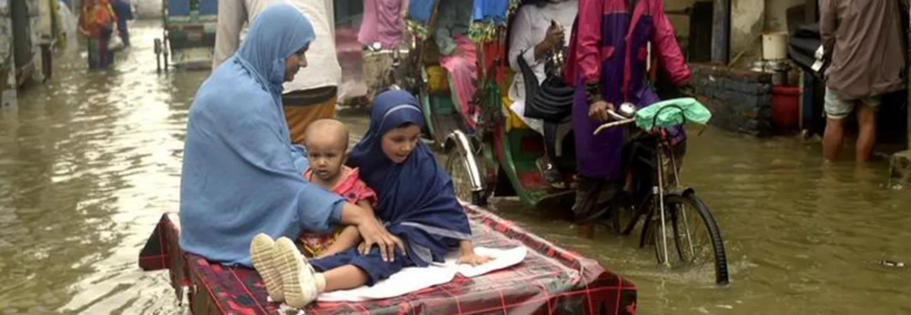 بنگلہ دیش، ڈھاکہ میں ایک سائیکل رکشہ مسافروں کے ساتھ سیلاب زدہ سڑک سے گزررہا ہے۔ (شِںہوا)