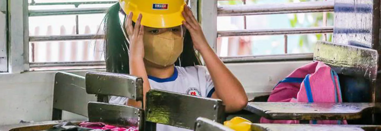 فلپائن ، منیلا کے ایک ایلیمنٹری سکول میں ایک بچہ سر پر سیفٹی ہیلمٹ پہنے قومی سطح پر زلزلے سے حفاظتی انتظامات کی مشق میں شریک ہے۔(شِنہوا)