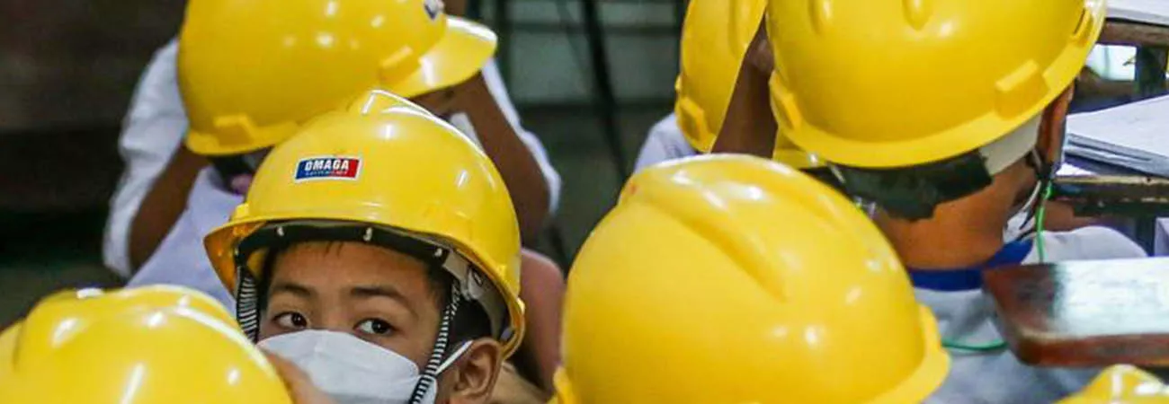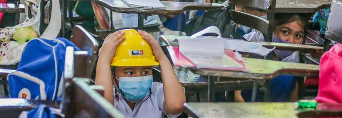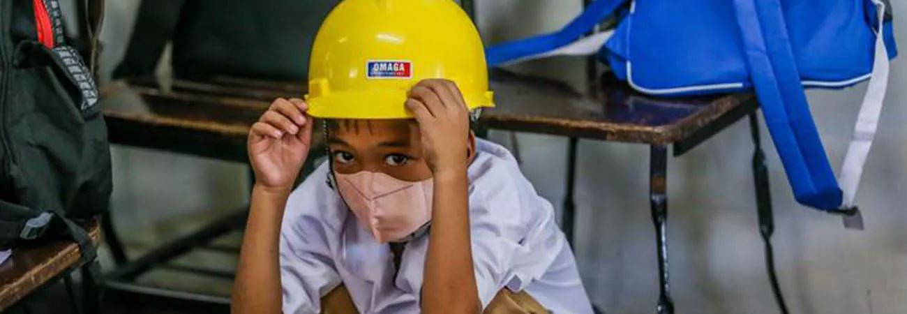 فلپائن ، منیلا کے ایک ایلیمنٹری سکول میں طالبعلم سر پر سیفٹی ہیلمٹ پہنے قومی سطح پر زلزلے سے حفاظتی انتظامات کی مشق میں شریک ہے۔(شِنہوا)