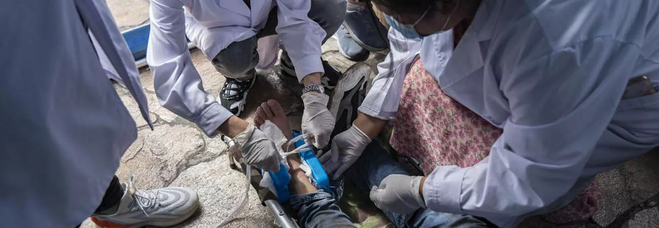 چین کے جنوب مغربی صوبے سیچھوآن کی کاؤنٹی لوڈنگ کے قصبے موشی میں قائم عارضی پناہ گاہ میں طبی اہلکار زلزلے کے باعث زخمی ہونیوالے شخص کا علاج کر رہے ہیں۔(شِنہوا)