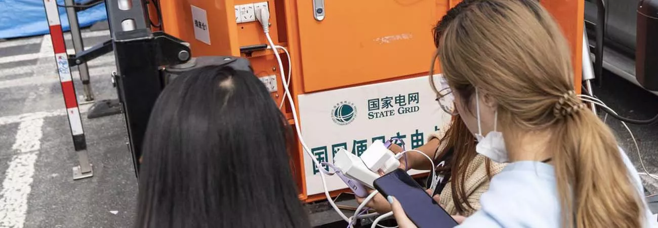 چین کے جنوب مغربی صوبے سیچھوآن کی کاؤنٹی لوڈنگ کے قصبے موشی میں ایک عارضی پناہ گاہ میں سٹیٹ گرڈ کی جانب سے قائم کردہ ایمرجنسی چارجنگ اسٹیشن پر لوگ اپنے موبائل فون چارج کر رہے ہیں۔(شِنہوا)